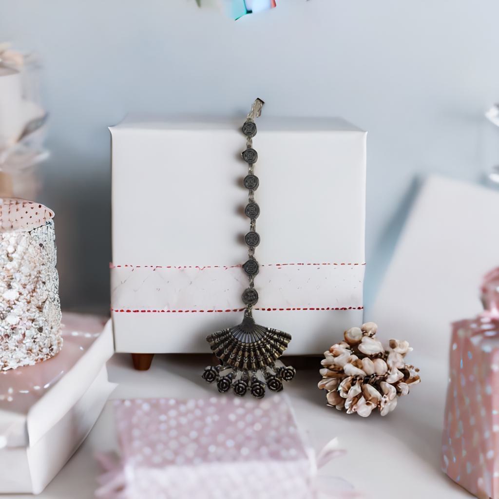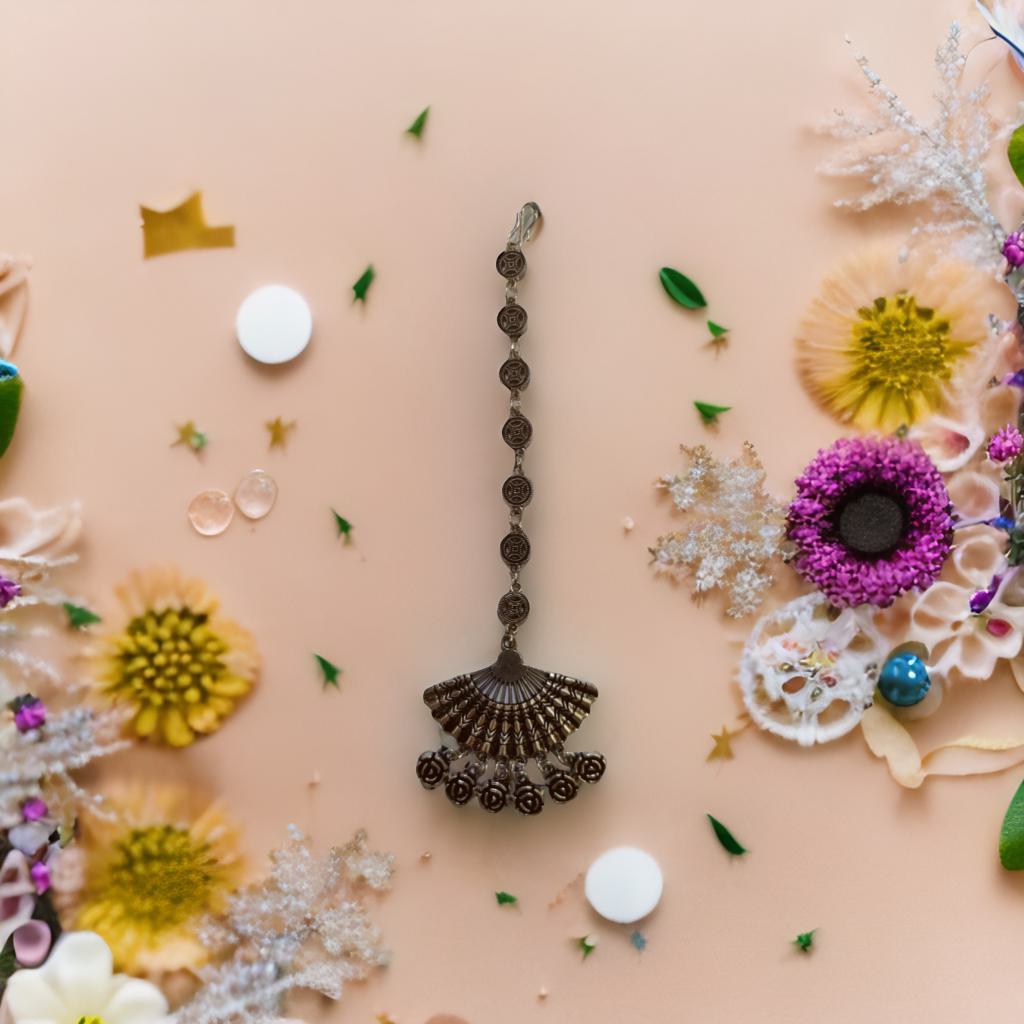 Add a charming twist to your ethnic ensemble with this Padmaroop Oxidised Maang Tikka. Its vintage-inspired design brings a playful sparkle to your forehead, perfect for weddings, festivals, or any celebration. Lightweight and easy to wear, it effortlessly enhances your traditional look with a hint of quirky elegance. Let this maang tikka be your signature style statement!